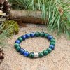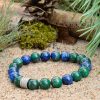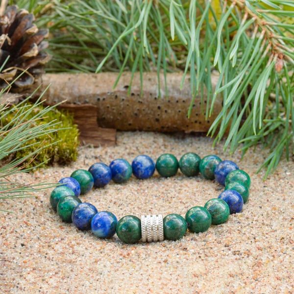 Bransoletka z chryzokolą i lazurytem wzmacnia i uwydatnia pozytywne cechy charakteru – samoświadomość, odwagę, wytrzymałość i pewność siebie, wzmacnia ciało fizyczne i duchowe, ożywia, napełnia witalnością i inicjatywą czakrę podstawy, sakralną i splotu słonecznego.