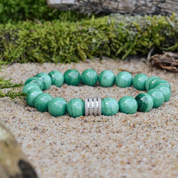 Bransoletka z malachitem to oszałamiająca biżuteria o bogatych zielonych odcieniach i wykwintnych wzorach. Malachit to kamień znany ze swoich żywych kolorów i unikalnych pasmowych lub wirujących wzorów, które wynikają z zawartości miedzi. Ten piękny kamień jest ceniony za swój estetyczny wygląd od wieków i jest często wykorzystywany w różnych formach biżuterii.